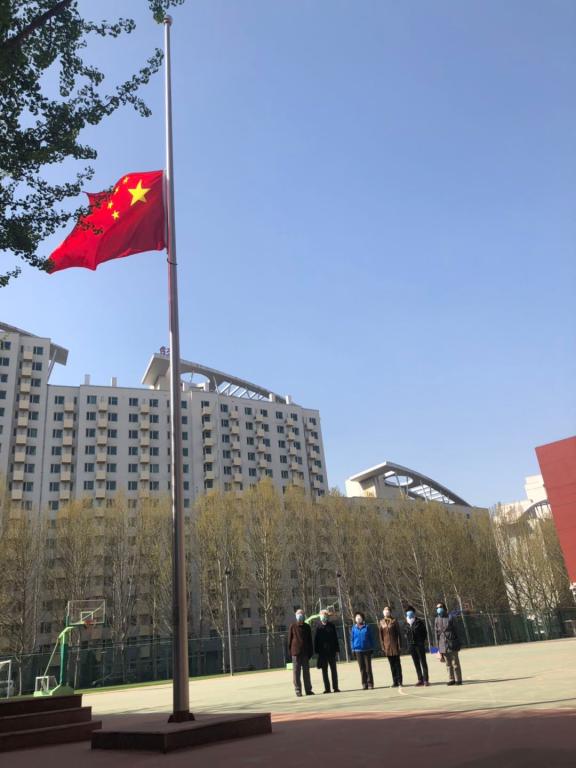 北航实验学校中学部退休支部倡议在家的老师们参加这次全国性哀悼活动,同时,居住在北航的几位党员同志,来到实验学校的校园,参加了今天的升旗及降半旗的活动。