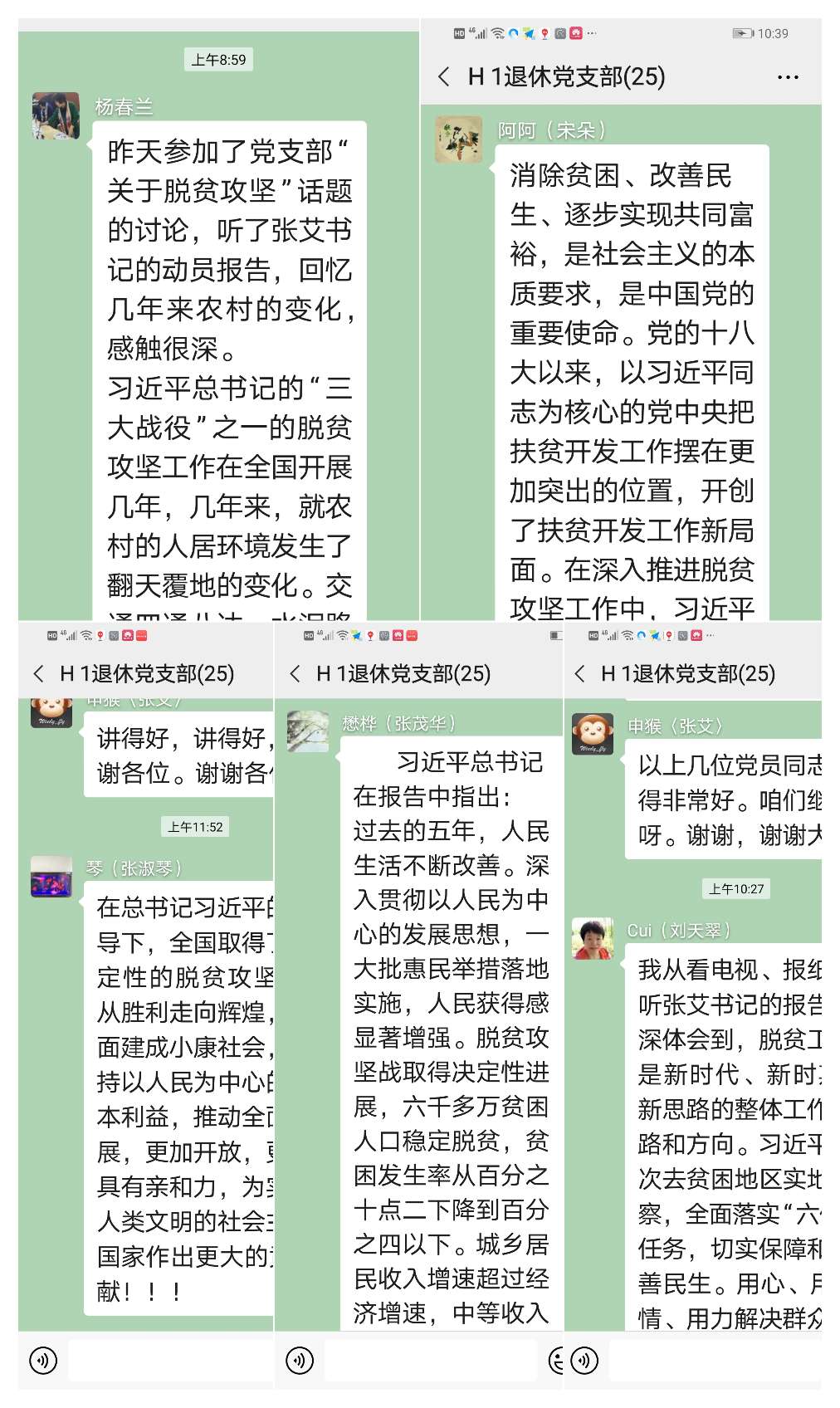 张艾同志谈到:今年是全面建成小康社会的决胜之年,突发的新冠疫情为脱贫攻坚增加了难度。然而,在党中央的正确领导下,疫情这场“大考”,我们回答得顽强且坚定。没有什么能阻止中国行稳致远、继续前行的脚步。我们基层党组织以及我们每个党员都要积极参与到脱贫攻坚的战斗中来,为脱贫攻坚建言献策,为脱贫攻坚助力,为脱贫攻坚发声。我们在脱贫攻坚领域取得了前所未有的成就,彰显了中国共产党领导的中国特色社会主义制度的政治优势。这些成绩的取得,凝聚了全党全国各族人民智慧和心血,是广大干部群众扎扎实实干出来的。我们基层党支部及每个党员要积极参与到活动中来,如参加志愿者服务工作;积极捐款捐物;帮助解决身边群众生活中的各种困难;以不同形式,不同方式,力所能及的做出贡献。