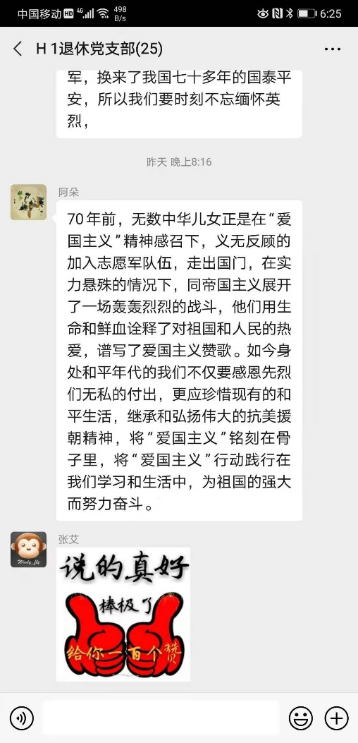 大家纷纷表示,要认真学习贯彻习近平总书记在纪念中国人民志愿军抗美援朝出国作战70周年大会上的重要讲话精神,学好党史、新中国史、改革开放史、社会主义发展史,大力弘扬伟大的抗美援朝精神。我们不会忘记那段历史,更不会忘记战争中牺牲的先烈,他们用自己的鲜血和生命换来了今天的山河无恙,国泰民安。烈士们的丰功伟绩将永远刻在我们心中。