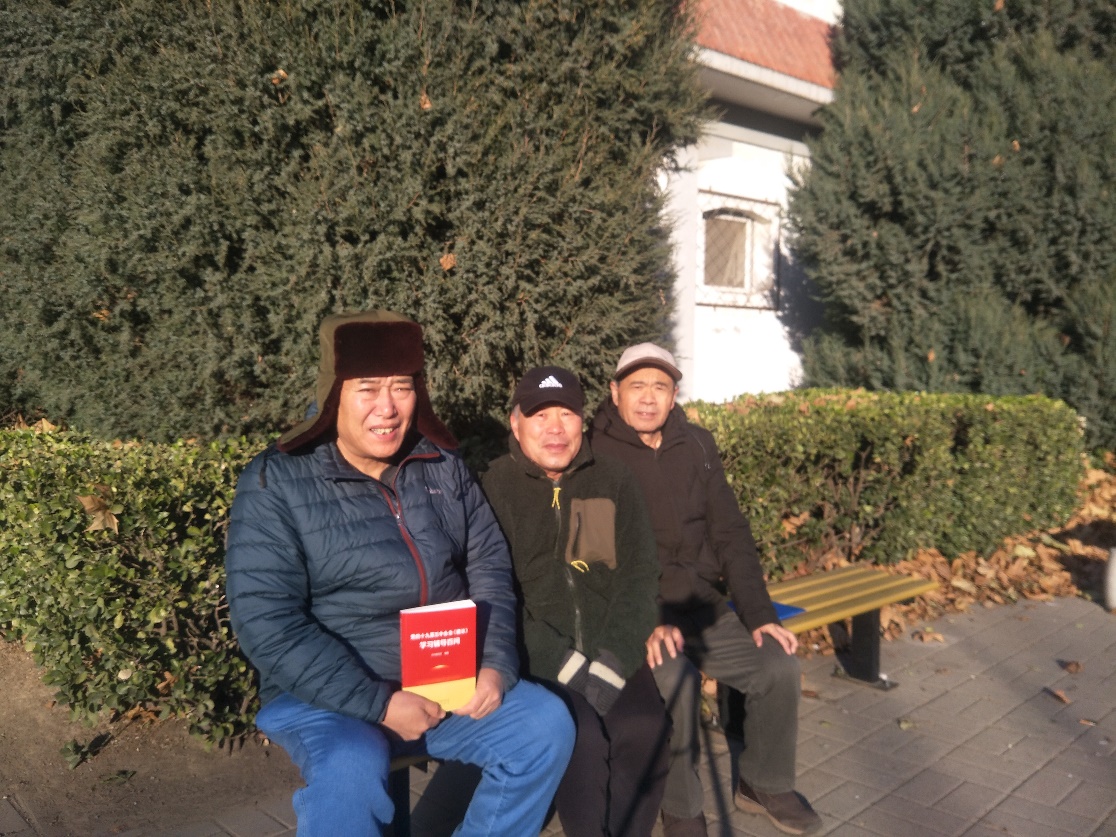 由于我们育新花园社区活动中心因装修不对外开放,所以没有党员集中学习的场所。为此我们党支部于12月14日下午三点,顶着寒风冒着室外温度零下七度的严寒,在马路边的小广场上召开了支委会,这是为了研究探讨在没有集中学习场所的情况下,老同志们如何开展“全会精神”的学习工作。