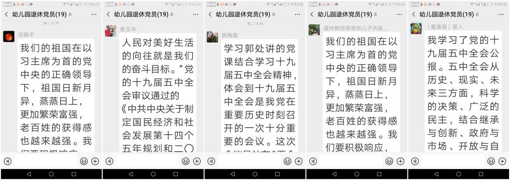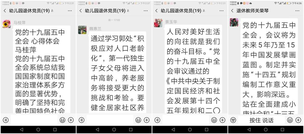 通过学习,党员同志们从多方面了解了中国未来的发展方向,深刻体会到我们党和国家对人口老龄化和老年人的重视,党中央的部署让老年人老有所养,老有所居,老有所乐,老有所依。相信在党中央坚强领导下,国家老龄事业、养老体系服务保障工作一定会越做越细、越做越实、越做越完善。学习结束后,大家纷纷将心得感悟发布到支部微信群中进行交流。在新的一年祝愿祖国更加繁荣昌盛,走向新辉煌,创造新奇迹,共同迎接新的挑战。