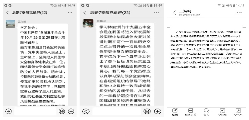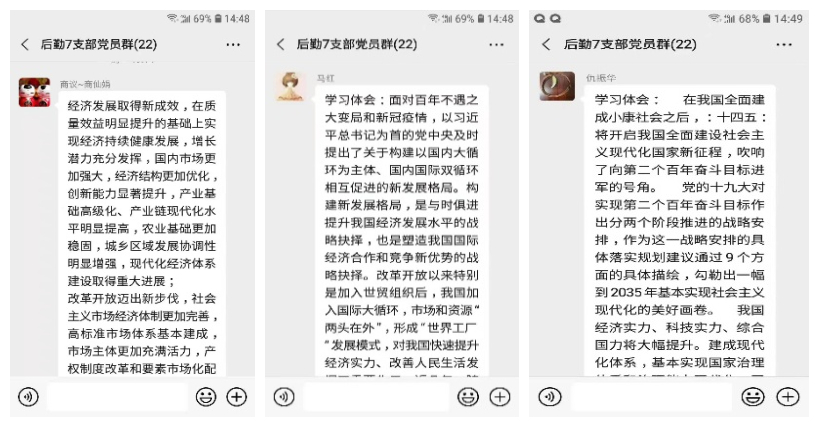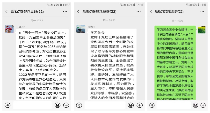 受疫情影响,后勤保障处退休职工第七党支部原本在线下组织的支部党员学习活动改为了线上学习交流,12月28日,支部部分党员在支部书记王勇红同志的组织下进行线上学习交流,并将深入学习十九届五中全会精神的心得体会上传到微信支部群里,大家踊跃发言,畅谈感受。
