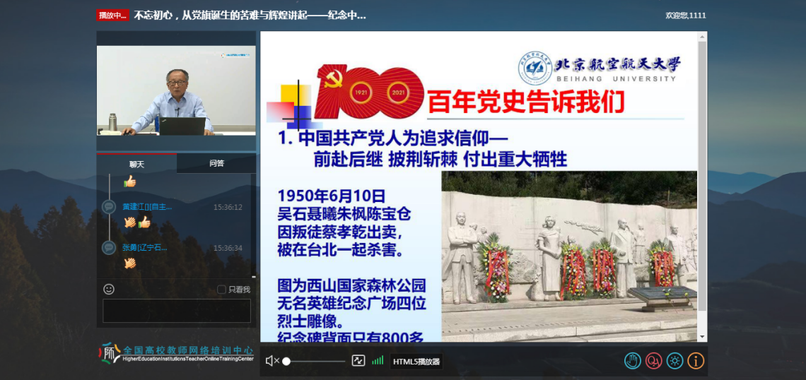 5月12日下午,在教育部全国高校网络培训中心,北航老教授报告团成员、关工委成员郑彦良教授在线为全国高校青年教师培训做了“不忘初心-党旗诞生的苦难与辉煌”讲座,500多名分布在全国各地的高校青年教师点对点在线全程收看了讲座。