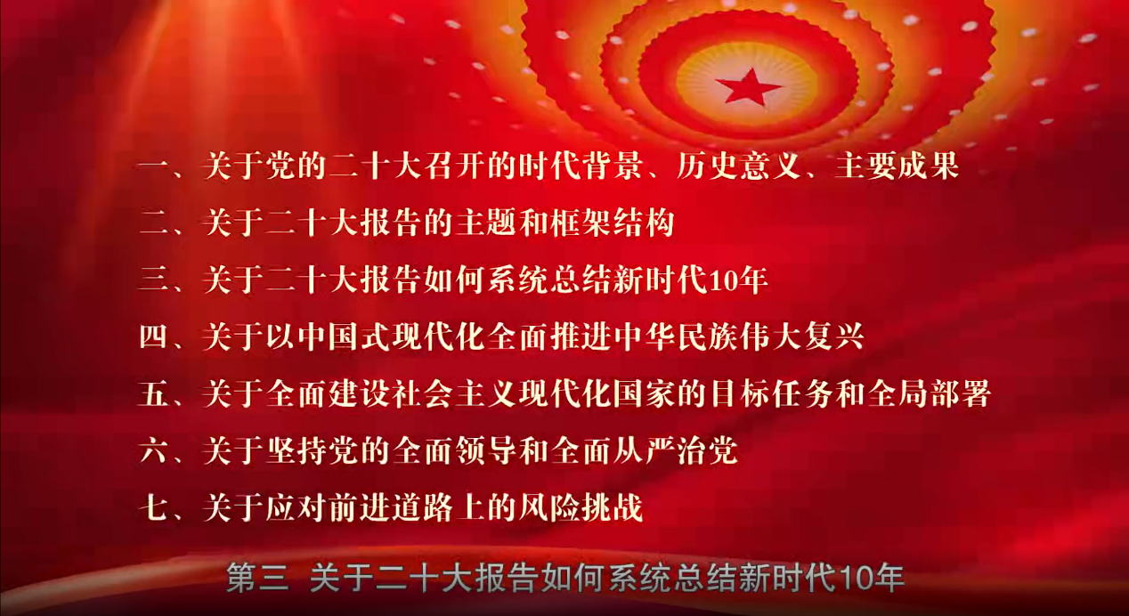 在宣讲报告中,施芝鸿以“系统总结新时代、全面布局新征程、锚定奋斗新目标、继续创造新局面”为题,从党的二十大召开的时代背景、历史意义、主要成果,二十大报告的主题和框架结构,二十大报告如何系统总结新时代十年,以中国式现代化全面推进中华民族伟大复兴,全面建设社会主义现代化国家的目标任务和全面部署,坚持党的全面领导和全面从严治党,应对前进道路上的风险挑战等七个方面,对党的二十大提出的重要思想、重要观点、重大战略、重大举措作了全面系统阐述和讲解。