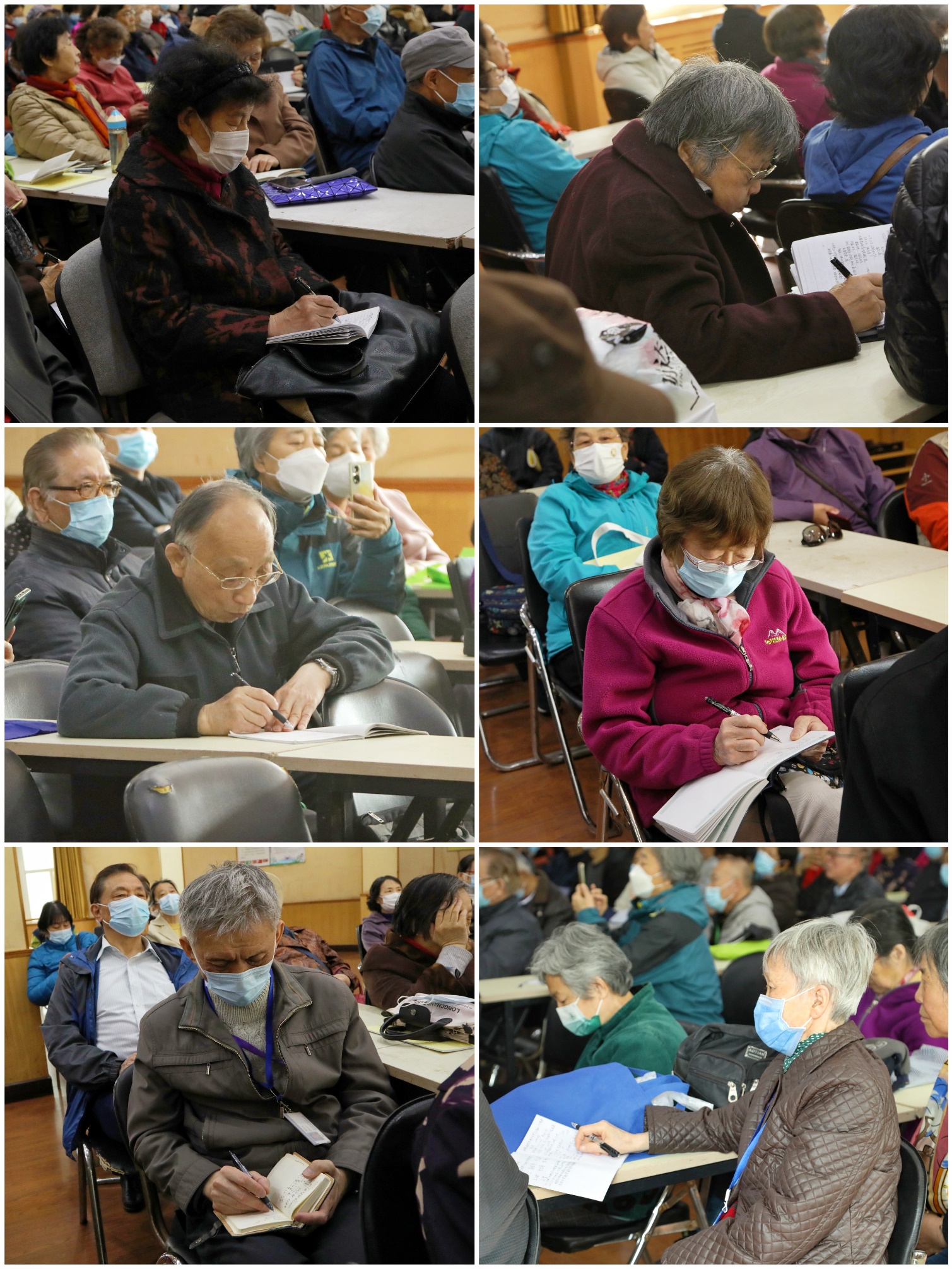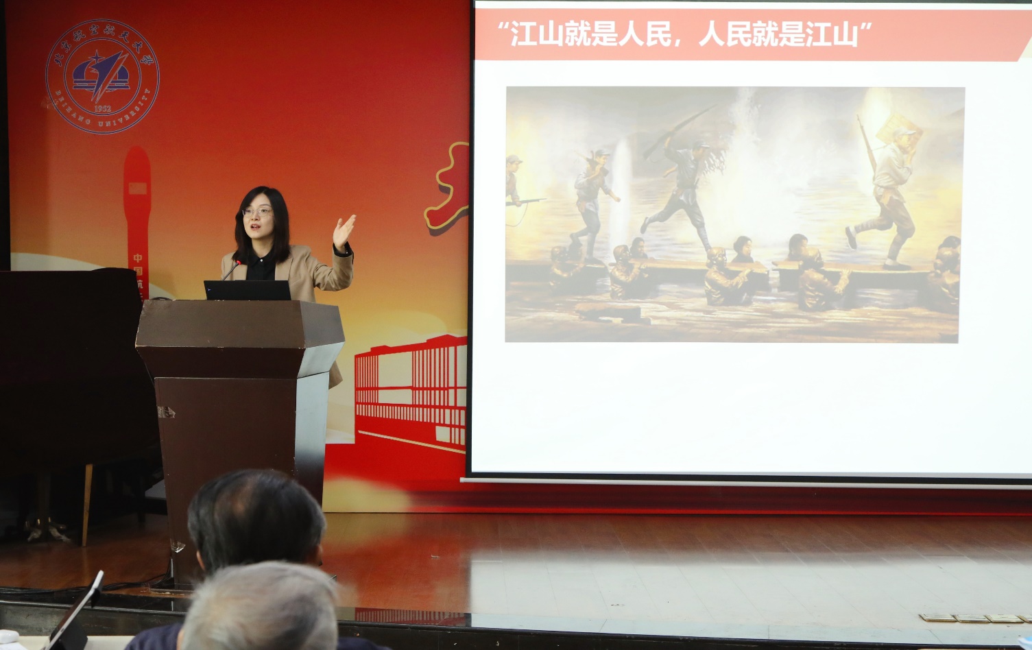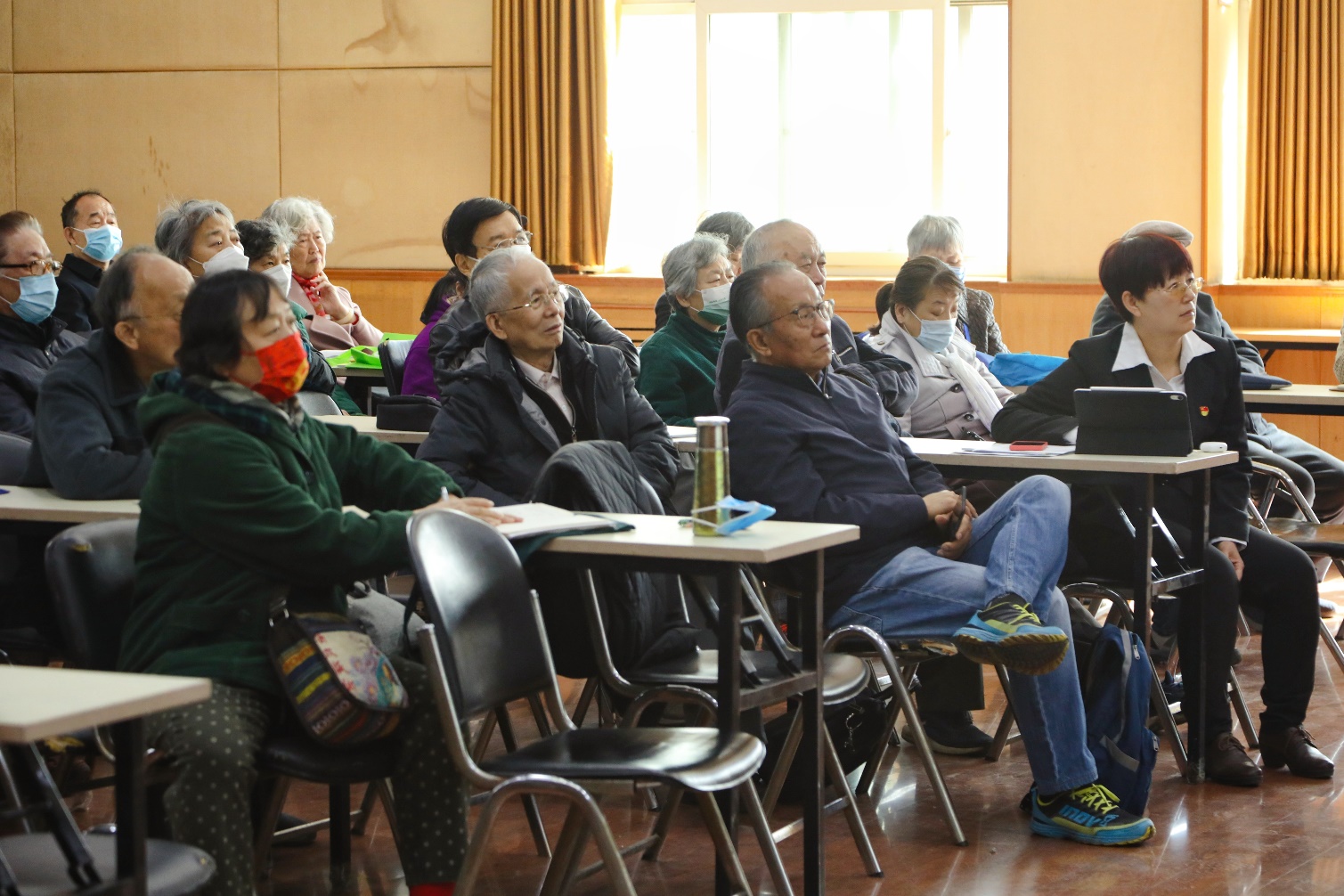 “在百年党史当中不同的阶段,人民分别扮演了什么样的角色?”思源楼多功能厅讲台上,付丽莎老师正指着屏幕上一张张老照片,讲述着背后一段段的人民故事。台下坐满了老同志,有的抬着头,若有所思,有的拿着笔,认真记录。
