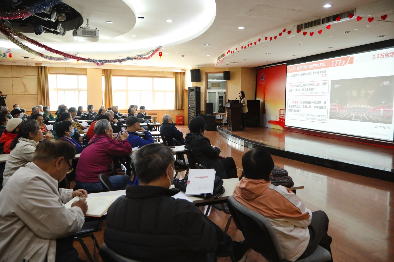 讲座中,付老师解读了党的二十大报告中出现频率很高的词汇,那就是“人民”两字。报告中“人民”两字出现了177次,字字千钧、寓意深远。人民万岁,从当时毛泽东提出这个口号到今天为止,已经不单纯是一个口号,它是我们党的牢固的执政理念。