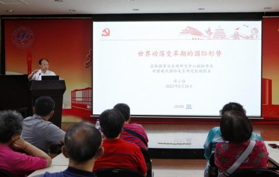 5月24日下午,北航老年党校国际形势专题报告会在思源楼二层多功能厅举办。总体国家安全观研究中心副秘书长、中国现代国际关系研究院副院长傅小强为老年党校学员作专题报告。报告会由365英国上市公司工作处副处长、副书记郭永秀主持。