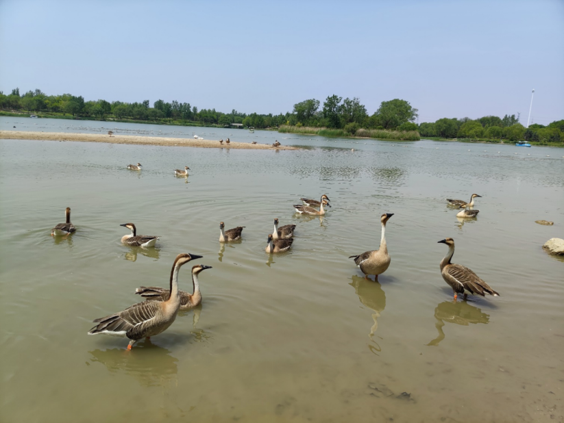 令人欣喜的是我们在湖中看见了很多灰雁,它们栖息在水中,有的低头在水中觅食,有的昂扬着脖子对天而歌,还有的振奋着翅膀想一飞冲天……这个场面真的久违了,湖中的自由嬉戏的鸟禽,充分说明了水质清亮,生态环境越来越好。人与鸟禽的和平共处,也是美好生活的印证。一旁的同志们兴奋无比,赶紧拿出面包喂它们。