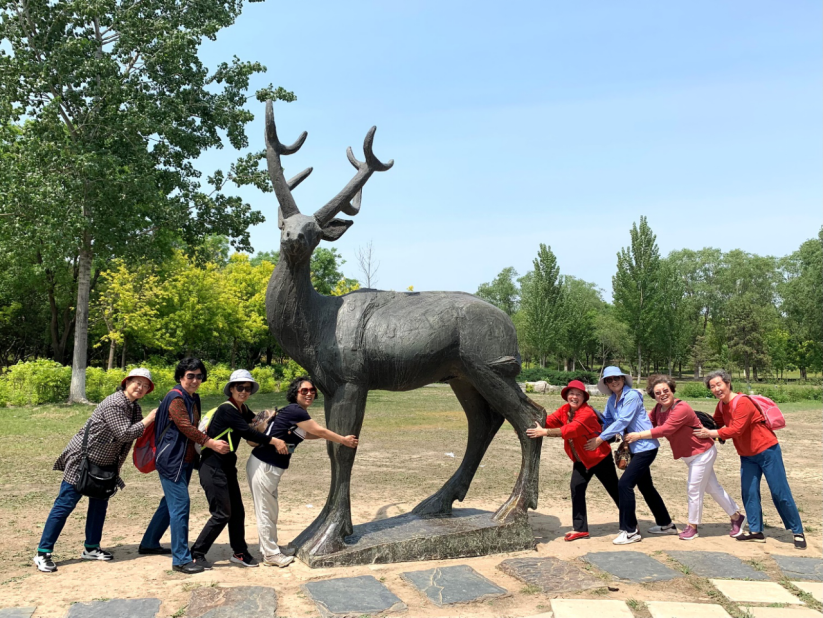 再往前走,来到麋鹿园,同志们在麋鹿雕塑前抱着麋鹿拍照留影。听到清丽悦耳的鸟鸣、看到满目的鲜花、碰到神采飞扬的游人,大家都特别开心,一个个笑靥如花,仿佛是回到了无忧无虑的童年时光,释放了情怀,绽放了芳华。
