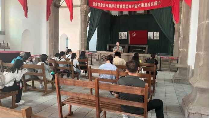大家凝视着普通的木桌和油灯,听着讲解员的介绍,仿佛见到了毛主席在灯下用激扬的文字,将马克思主义同中国实际相结合,带领人民冲破思想枷锁,解决中国革命的基本问题。