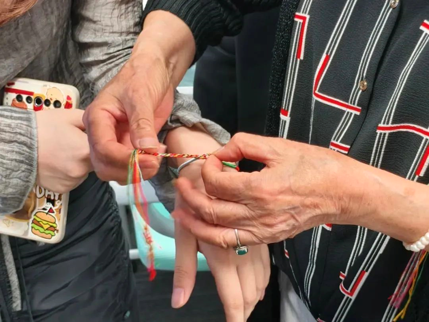 彩线轻缠红玉臂,佳人相见一千年。五彩绳,用红绿黄白黑色粗丝线搓成彩色线绳,一般在端午节佩戴五色丝线以辟邪,兼有祈福纳吉的美好寓意。现场,退休老师朱桂芳为同学们讲授五彩绳的编织和系法。