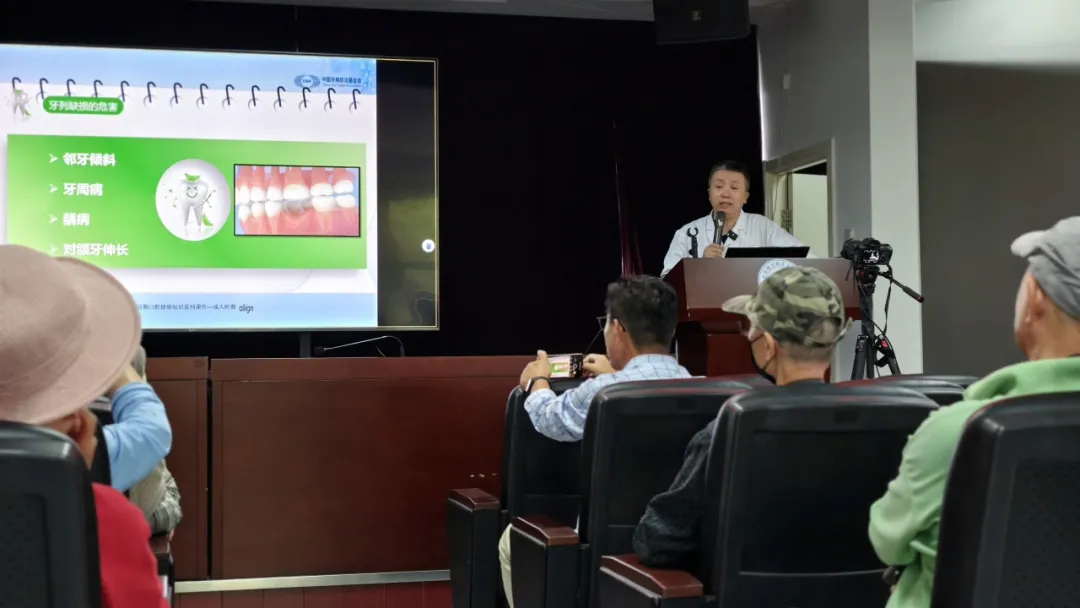 讲座围绕“镶牙”主题展开,冯医生详细讲解了牙列缺损的危害及修复的重要性。他依次介绍了固定义齿、可摘义齿和种植义齿的原理、优缺点及适用人群,结合老年人口腔的常见问题,用通俗易懂的语言,帮助大家深入理解不同镶牙方式。