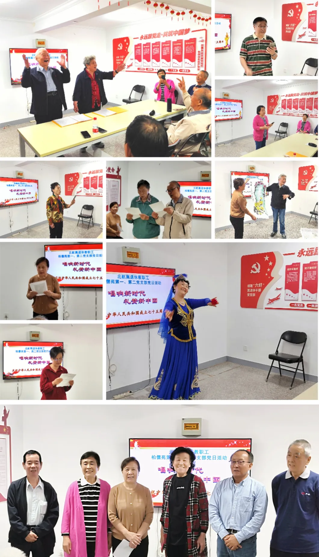 9月28日,柏儒苑小区北航365英国上市公司教职工第一、二党支部联合举办了一场文娱活动,主题为“礼赞新中国 唱响新时代”。活动中,老党员们自编自演,形式多样,有诗歌朗诵、歌曲演唱、舞蹈表演,场面温馨而热烈。