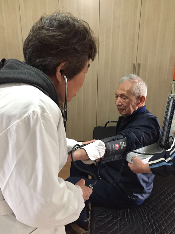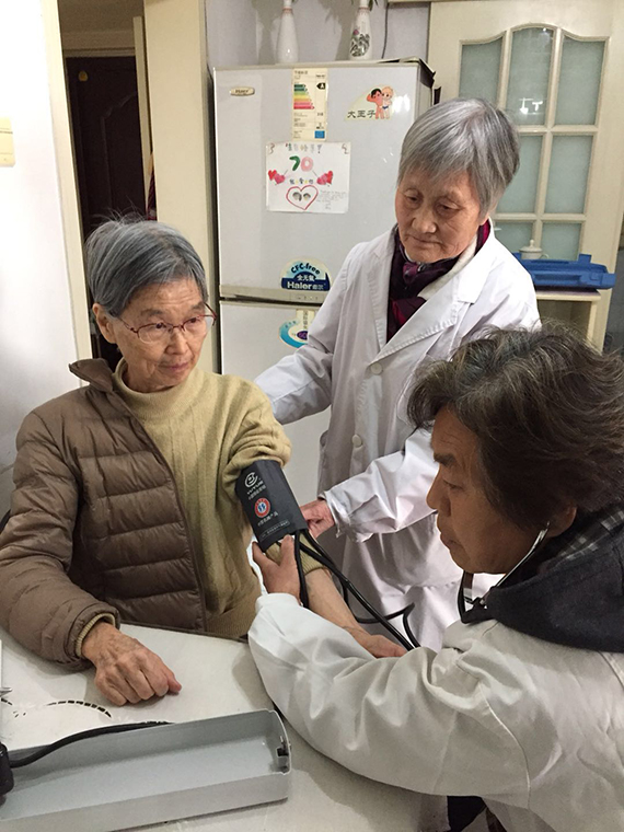 此次上门服务活动先后走访了七位行动不便的老同志,其中有三位达96岁高龄,最小的也有81岁。每到一家,退休的大夫们给老同志测量血压,进行心脏、血氧饱和度以及心电图等多项检查,指导他们做肢体的康复训练,并仔细说明了他们的身体情况和平时应该注意的事项。如96岁高龄的王文秀同志,因长期卧床,两肺湿性啰音,精神不佳,大夫们就叮嘱家属多加注意,应及时到医院进行检查。
