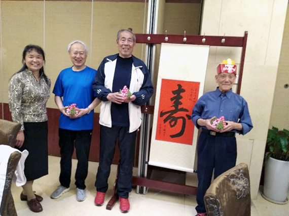 支部向三位寿星赠送了编制的寿桃,特意为90岁的王天义老师赠送了大红“寿”字的书法作品,大家在寿宴中互相交谈,其乐融融,祝寿会在祥和愉快的气氛中结束。