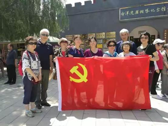 在白洋淀雁翎队纪念馆前,大家展开鲜红的党旗合影留念,缅怀白洋淀人民在中国共产党领导下英勇抗击日寇的先烈们。
