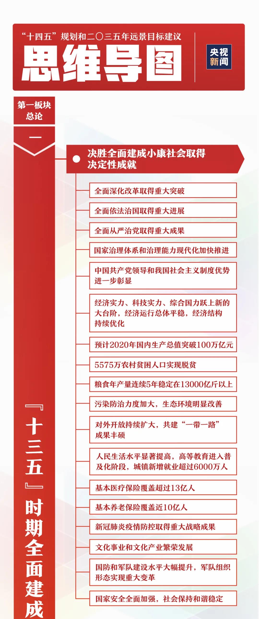 近日,《中共中央关于制定国民经济和社会发展第十四个五年规划和二〇三五年远景目标的建议》发布。建议稿由15个部分构成,分为三大板块,共60条。今天,央视新闻为你准备了一张思维导图,一起了解、学习要点。