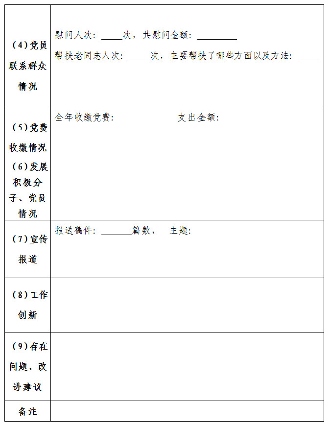 (1)学习贯彻党的十九大精神情况;(2)支部规范化建设情况;支部班子和制度建设情况;(3)“三会一课”和组织生活、主题党日活动情况;(4)支部战斗堡垒作用和党员先锋模范作用;(5)党员联系群众关心群众情况;(6)党员发展、教育、管理和监督;(7)支部工作取得的特色成效、存在的问题、加强和改进工作的思路措施;(8)对合理设置党支部(党小组)的建议。