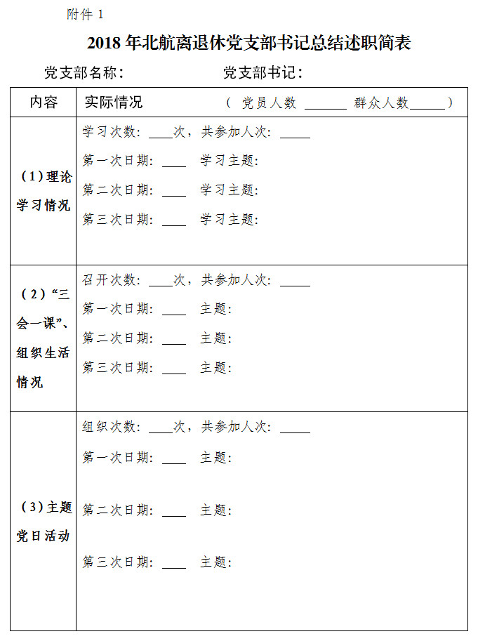 参加现场述职以及未参加现场述职的支部书记,均填写年度工作总结述职简表(见附件1),请各位党支部书记于1月14日前将年度工作总结述职简表交至思源楼102党务办(电子版发送微信或者邮箱:bhltx@buaa.edu.cn