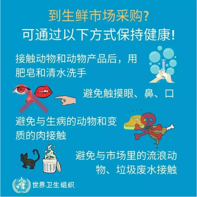 1.避免接触禽畜、野生动物及其排泄物和分泌物,避免购买活禽和野生动物。