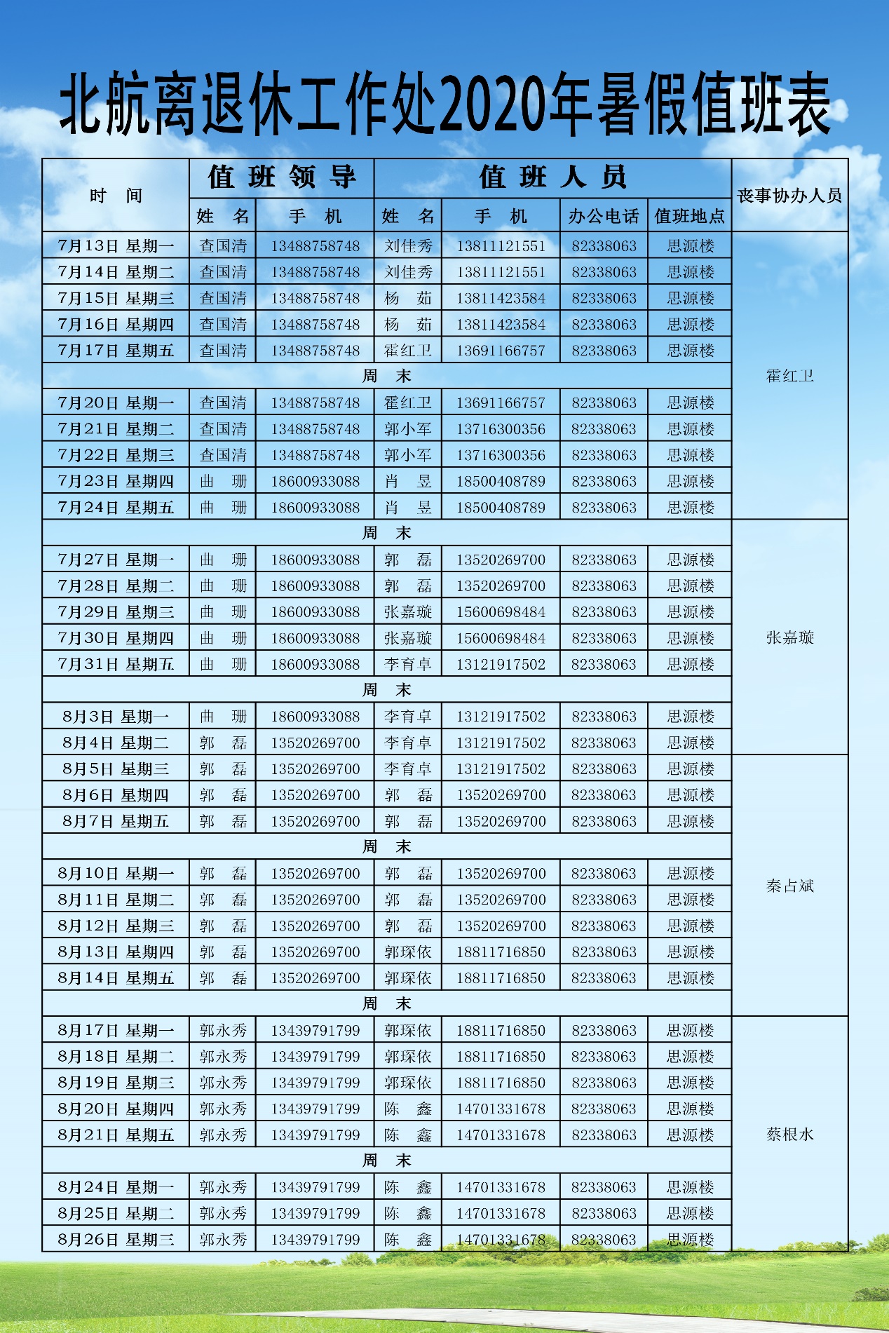 根据学校暑假安排,教职工暑假自2020年7月13日(星期一)至8月26日(星期三)止,8月27日(星期四)正式上班。结合365英国上市公司工作处工作安排和实际情况, 按照学校要求,365英国上市公司工作处做了假期值班安排,大家有事情,可以参照值班表上的电话号码进行办理或者电话咨询(暑期值班期间办理的业务与每周值班值守办理的业务相同),具体安排如下: