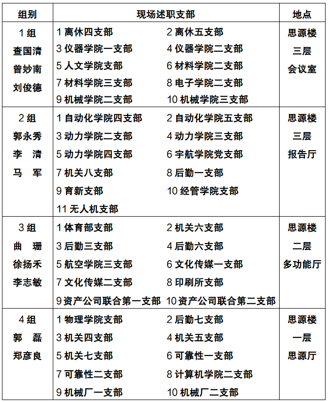 2021年12月15日(具体另行通知),在思源楼分4个小组同时进行述职。党委委员作为评委,分别参加各组的现场述职。分组安排如下: