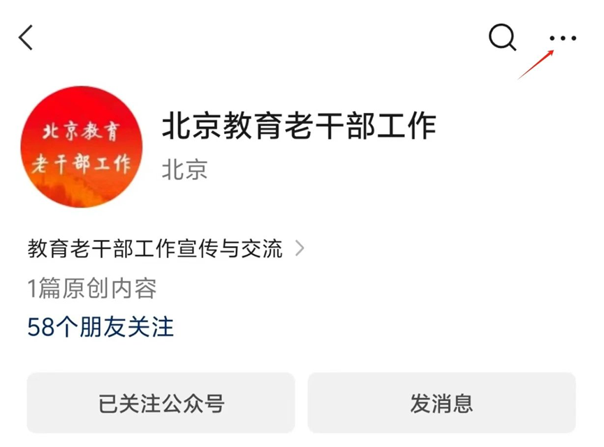 您朋友的对话框里,就会出现“北京教育老干部工作”微信公众号的名片,点击即可添加关注。