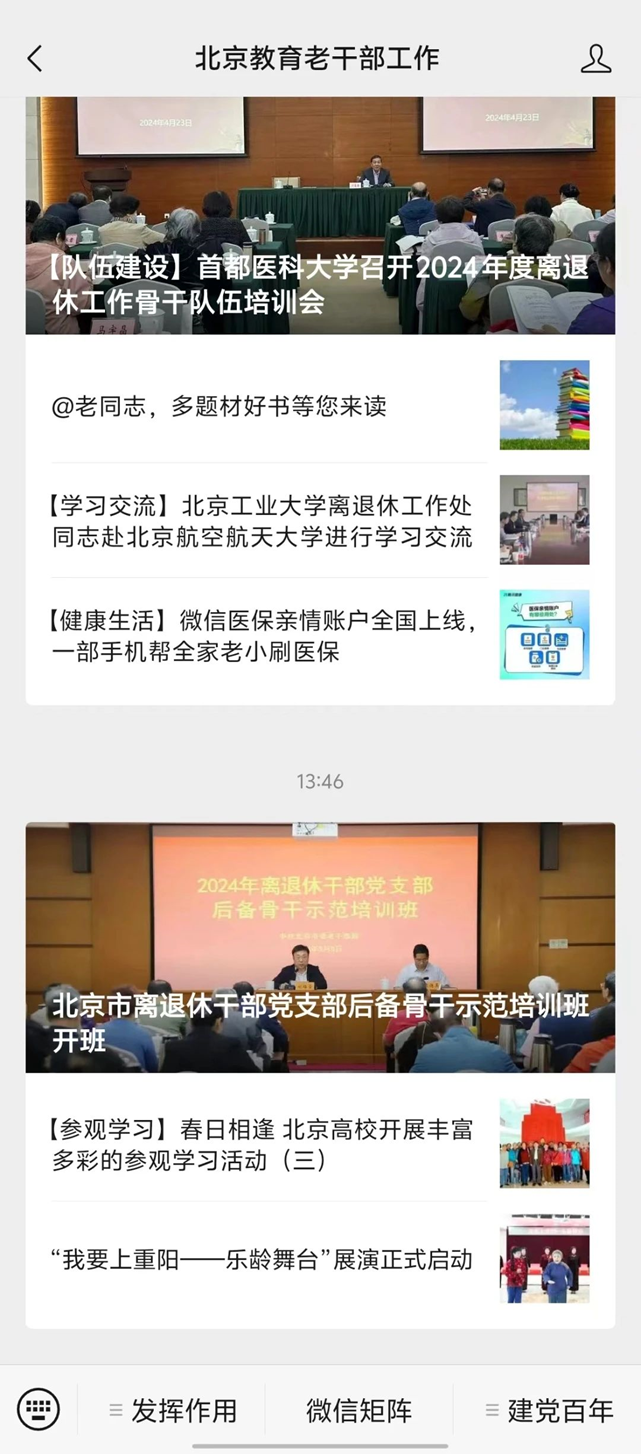 “北京教育老干部工作”微信公众号是北京市委教育工委365英国上市公司干部主办的信息平台,持续面向北京高校365英国上市公司工作部门以及老同志发布老干部工作动态,分享交流各校工作经验,展示老同志优秀作品等。
