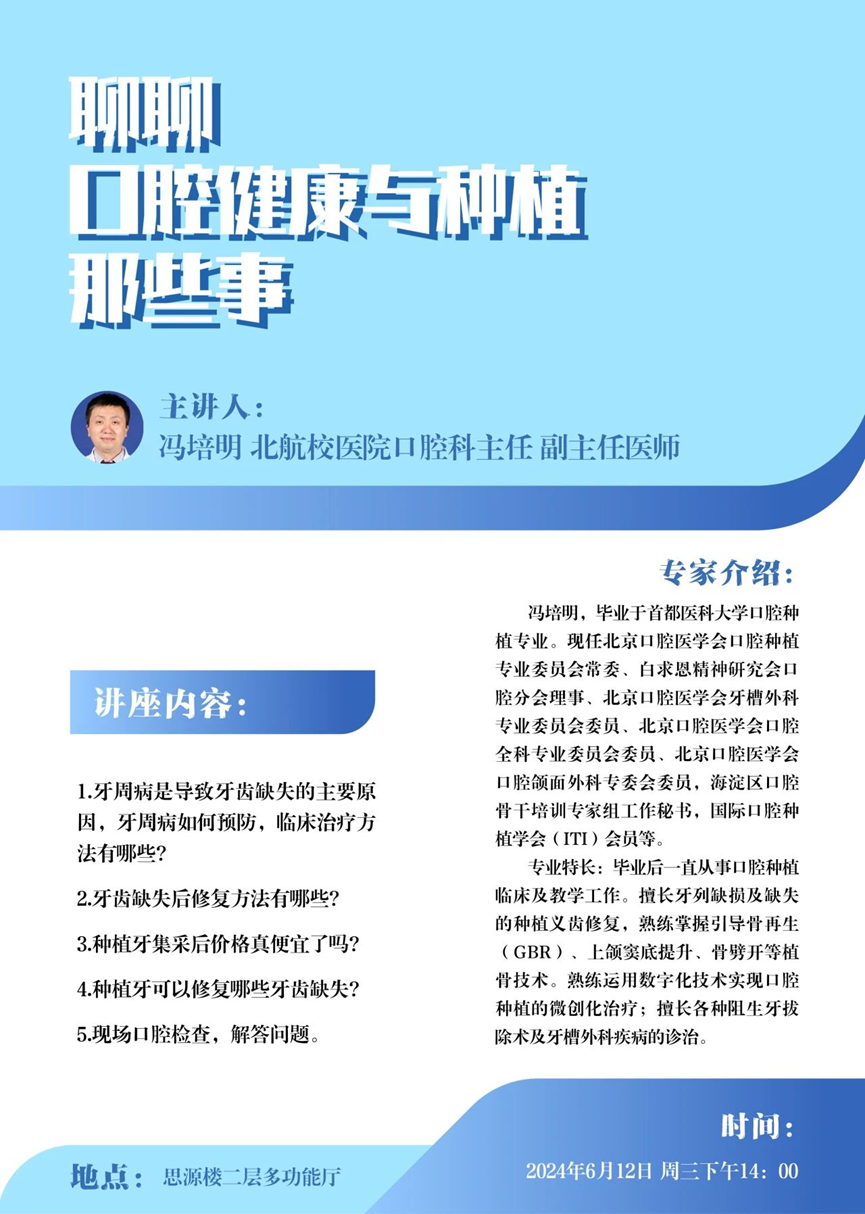 为了让大家有更深入的了解,6月12日(周三)下午14:00思源楼二层多功能厅,北航校医院口腔科主任副主任医师冯培明受邀走进思源讲堂,重点围绕牙龈疾病预防、种植治疗等方面帮助大家正确面对口腔健康问题。