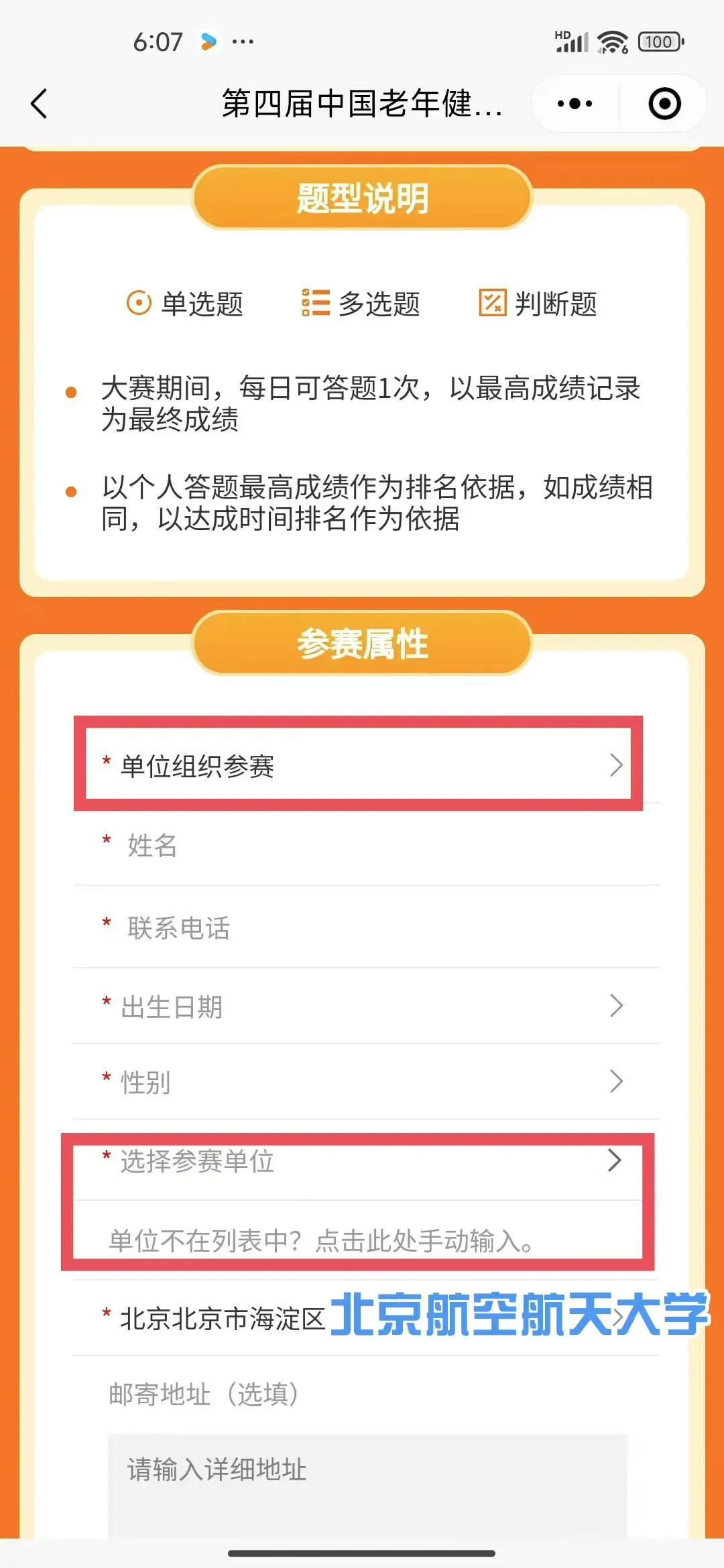 4. 填写信息,标记∗的为必填信息,其中参赛属性为“单位组织参赛”,填写参赛单位时,手动输入“北京航空航天大学”,信息填写完整后开始答题。