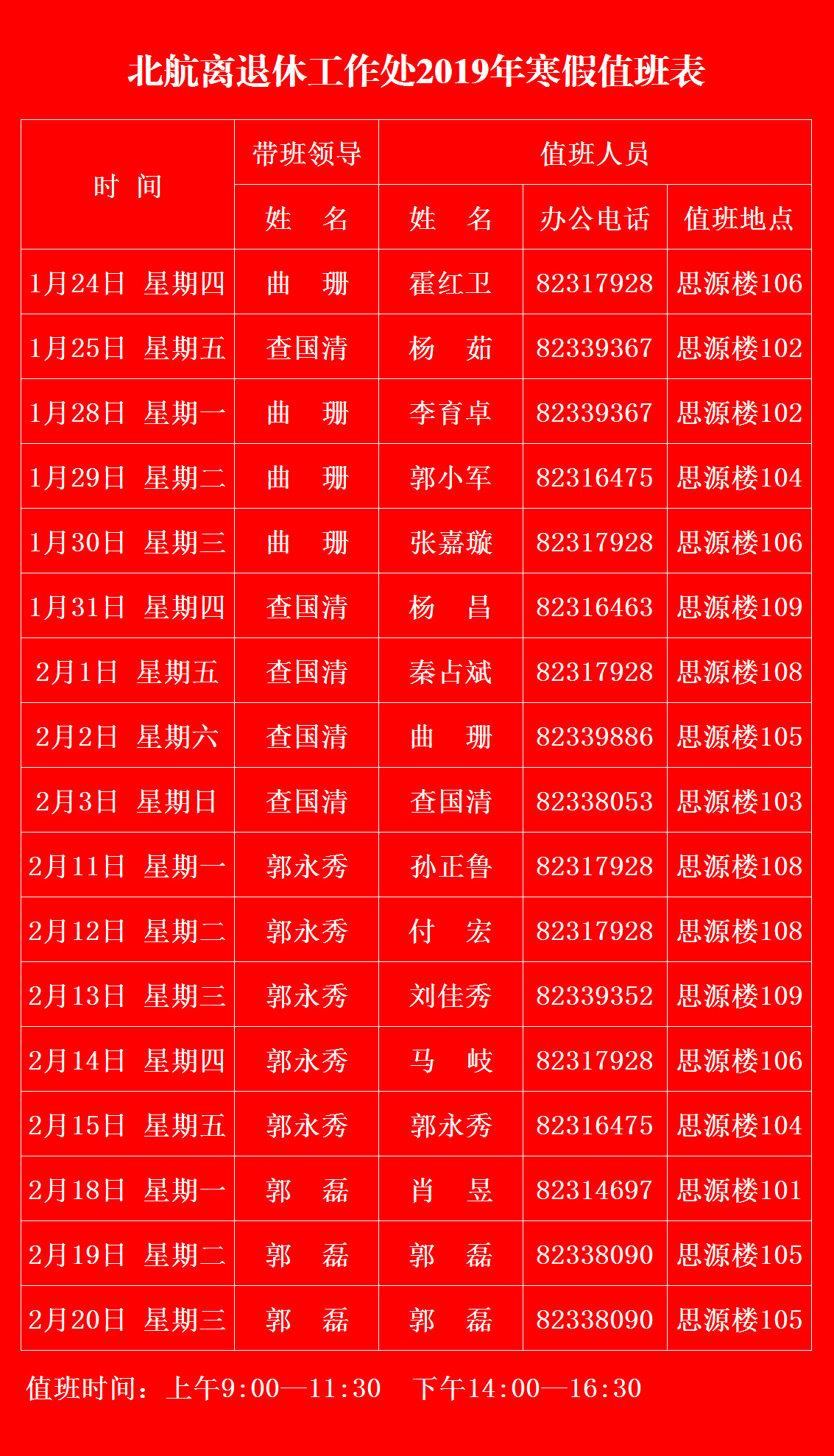 根据学校寒假安排,教职工寒假自2019年1月24日(星期四)至2月20日(星期三)止,(春节法定假日和星期六、星期日除外),2月21日(星期四)正式上班。结合365英国上市公司工作处工作安排和实际情况,按照学校要求,365英国上市公司处做了假期值班安排,大家有事情,可以参照值班表上的办公室或者电话号码进行办理或者电话咨询(“带班领导”一栏不具体在办公室里办公,“值班人员”一栏是在当日来办公室里具体工作),提前祝大家新春吉祥如意、猪年诸事顺利!表格如下: