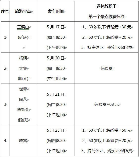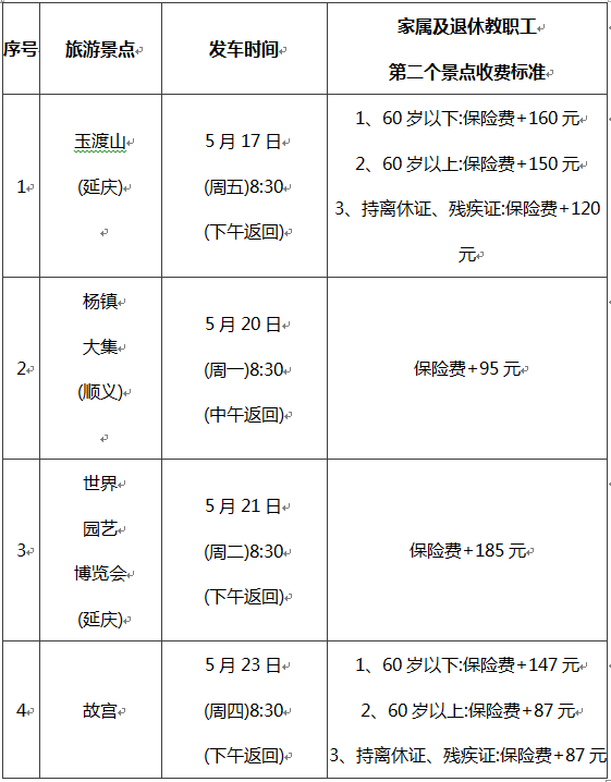 (2)退休教职工可以在以上四个景点中任选一个参加,根据自身需要选择并交纳相应的保险费。