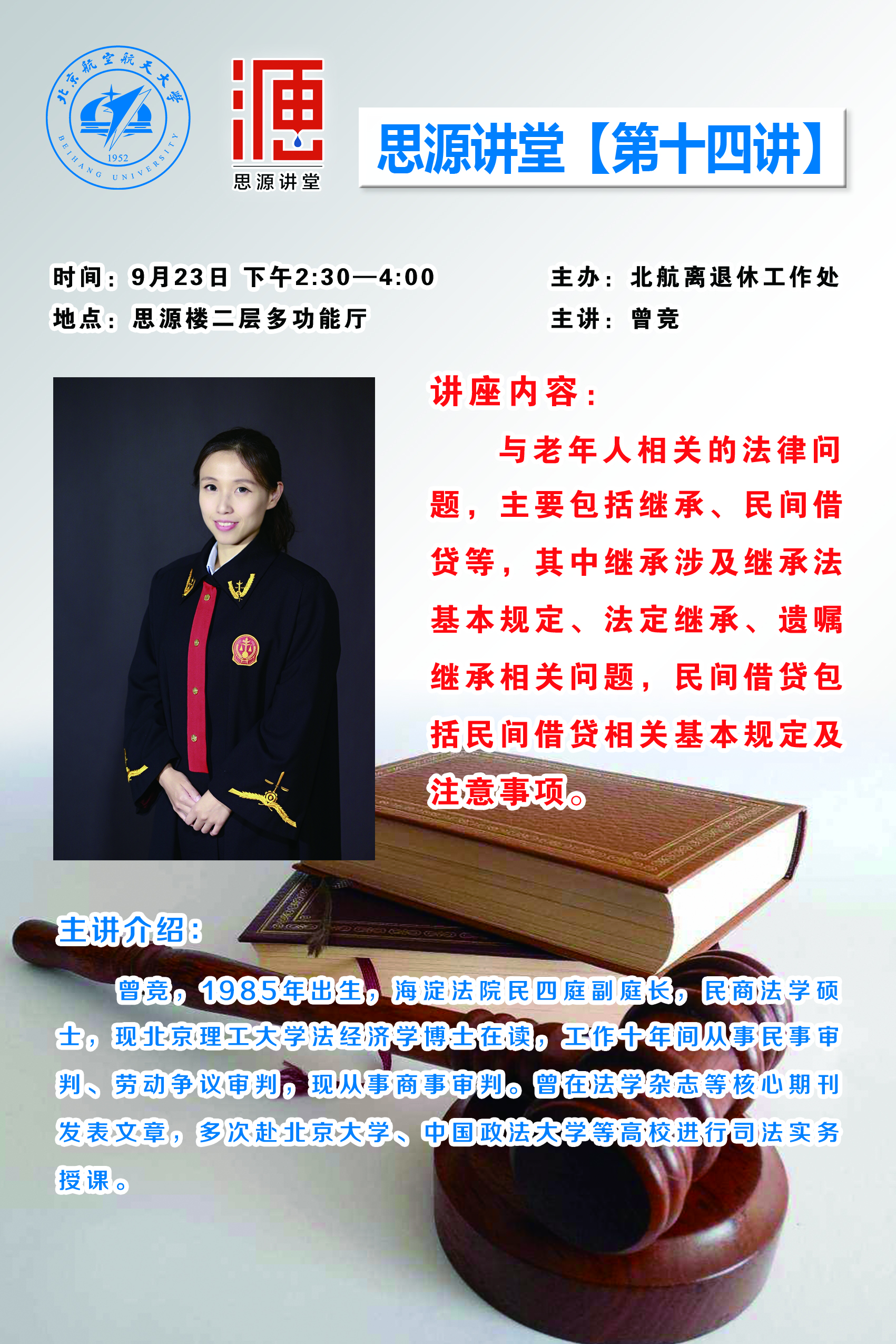 讲座主要内容:与老年人相关的法律问题,主要包括继承、民间借贷等,其中继承涉及继承法基本规定、法定继承、遗嘱继承相关问题,民间借贷包括民间借贷相关基本规定及注意事项。