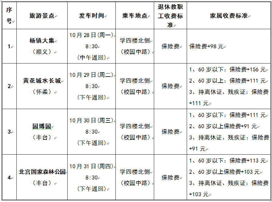 (2)退休教职工可以在以上四个景点中任选一个参加,根据自身需要选择并交纳相应的保险费。