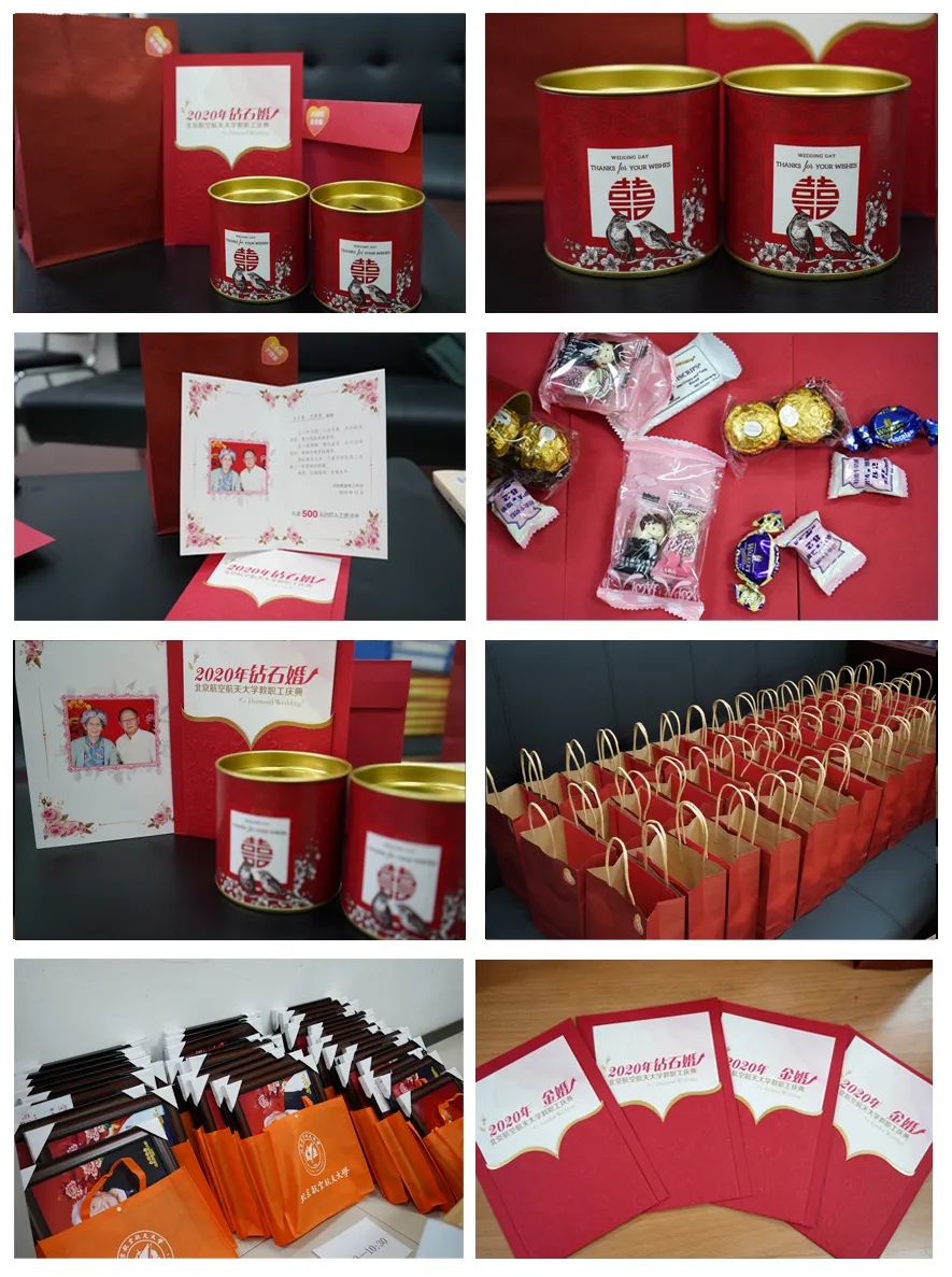 学校为前辈夫妇们献上贺礼,为他们拍摄结婚周年纪念照,记录美好瞬间,制作成20寸装框照片;并定制贺卡、喜糖等礼物,祝愿老前辈们百年好合、甜甜蜜蜜。