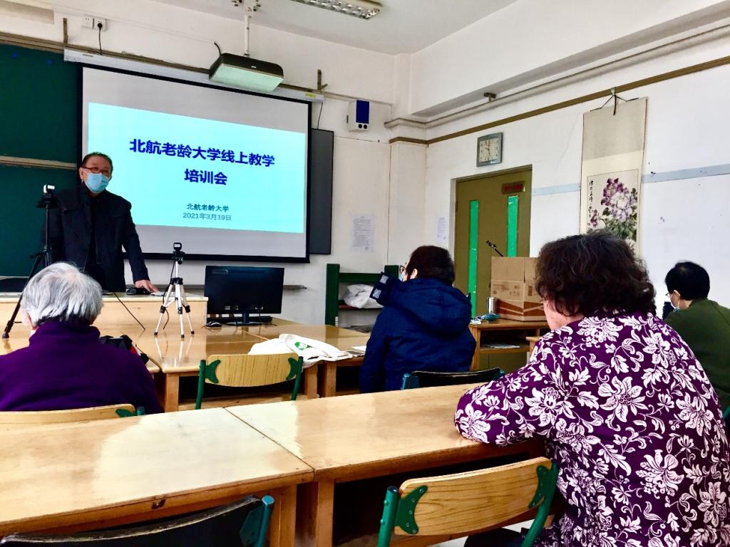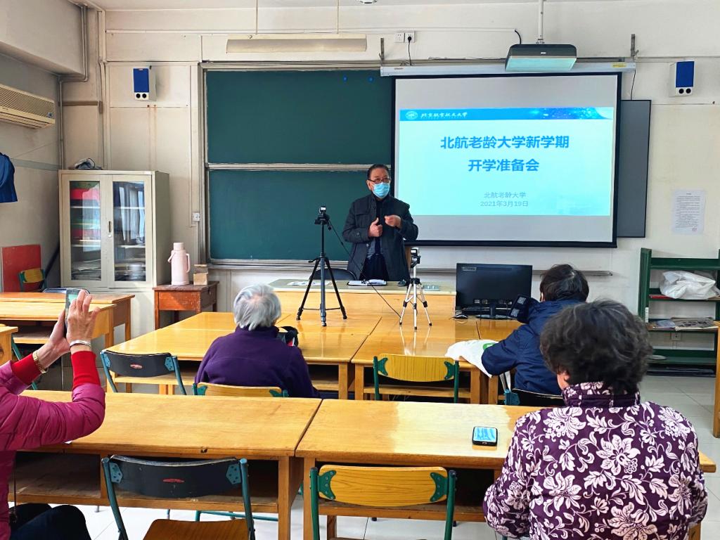 3月19日上午,北航老龄大学在思源楼202教室召开2021年春季学期开学准备会暨线上教学培训会,校长武登春、老龄大学全体管理人员以及学员代表参会。