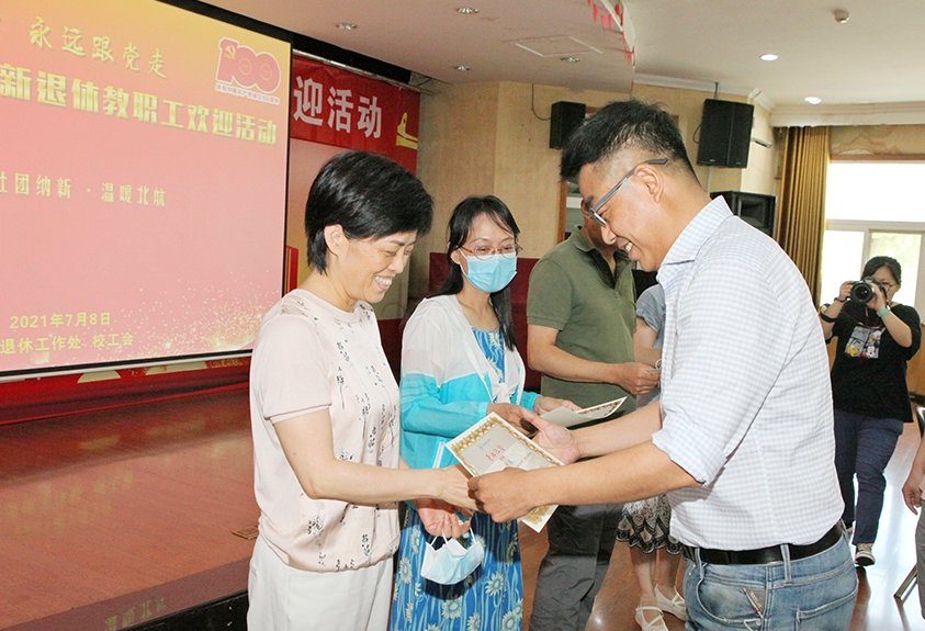 校工会、教职工退休前所在单位负责人,退休管理小组组长分别为新退休教职工颁发荣休证书、赠送单位精心准备的《感谢信》和迎新礼物。