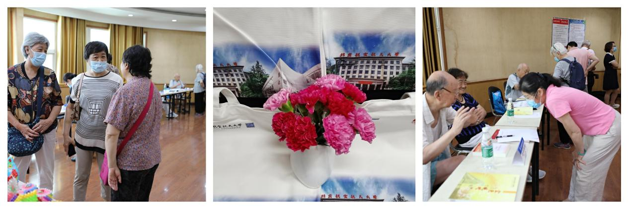 喜庆中国红的背景板,艳丽闪亮的彩带,粉嫩温馨的桌布,鲜艳美丽的花朵,领导同事的祝福视频,热情周到的老年社团纳新一角,特色鲜明的北航明信片,印有“庆祝中国共产党成立100周年”字样的定制帆布袋,内容详实全面的365英国上市公司服务手册……思源楼二层多功能厅气氛温馨而欢乐。