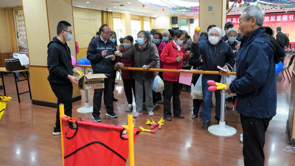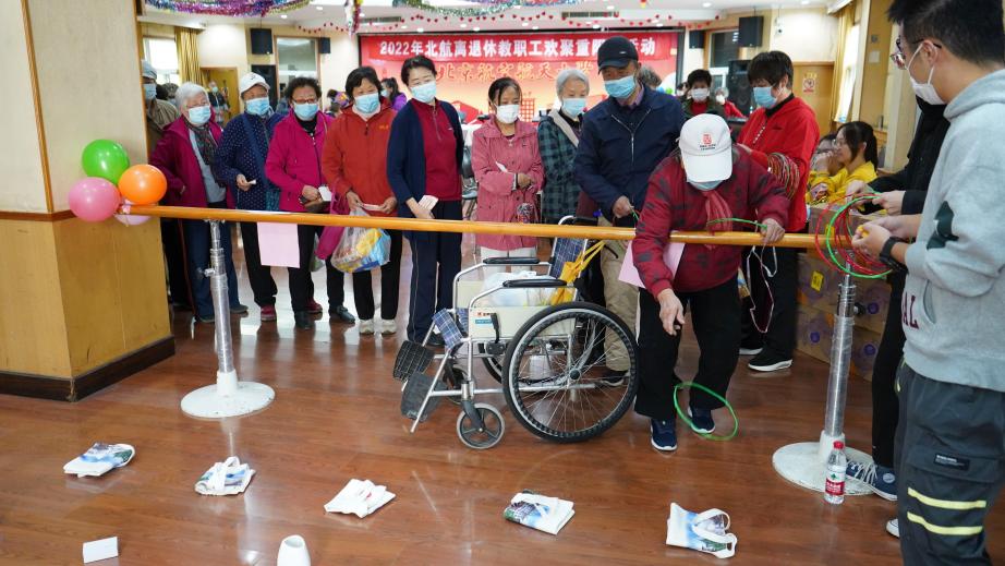 活动下半场为现场体验趣味游戏,老同志个个热情饱满。趣味套圈,老同志手拿门票纷纷领取套圈,向自己心仪的奖品发起“进攻”;托球行走,右手托球小心翼翼平衡地从起点走到终点;投篮挑战游戏充分调动了老同志参与活动的热情,个个大显身手。伴随着现场欢快的暖场音乐及朝夕相处好友的陪伴,老同志沉浸在有声有色、有动有静的游戏带来的乐趣之中。