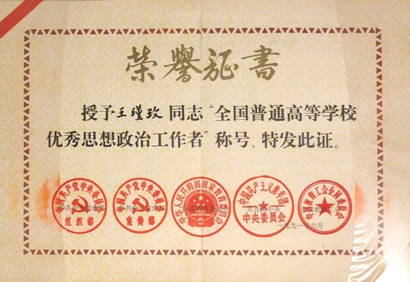 王瑾玫老师高兴地向我们展示了1991年由中组部、中宣部、国家教委、共青团中央、全国教育工会5个部门联合颁发的享受劳模待遇的“全国普通高等学校优秀思想政治工作者”的证书。