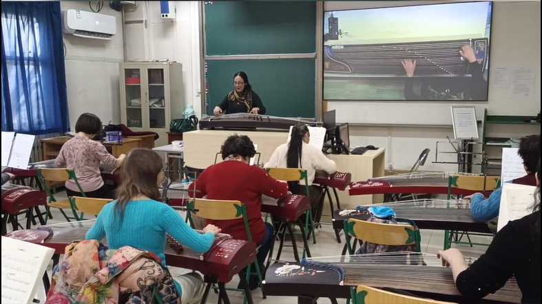 自今年9月古筝课开班以来,老龄大学为老师和学员们人手准备了一架古筝。讲台顶部的投影,将老师的指法实时且清晰地反馈给同学们。“一二三四、一二三四,铮,铮铮……”学员们在易玉琴老师的引导下,一齐演奏着乐曲《孟姜女》。