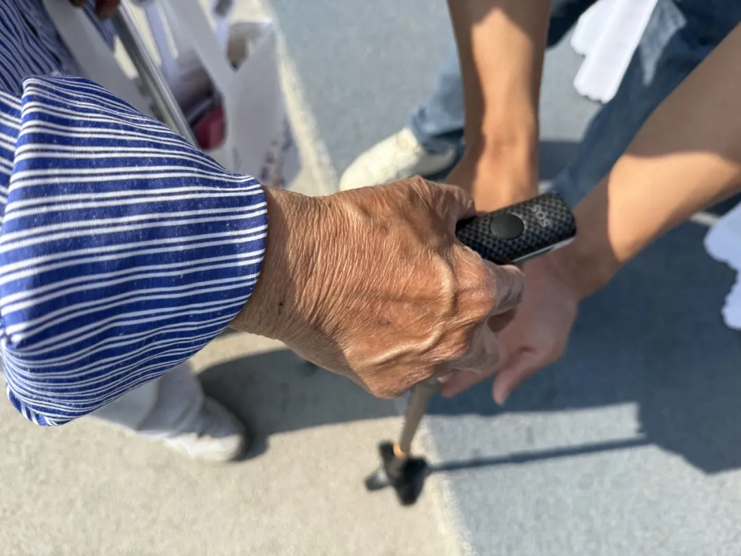 “您看见手杖上这个按键了吗?您如果出现不舒服需要求助,可以直接按一下这个键,然后电话就会拨给您的孩子或者我们服务人员;如果您摔倒了,这个手杖会自动识别并给我们打电话。”工作人员一边演示一边讲解,老同志连声感叹:“科技赋能养老,让独居生活多了一份安心。”