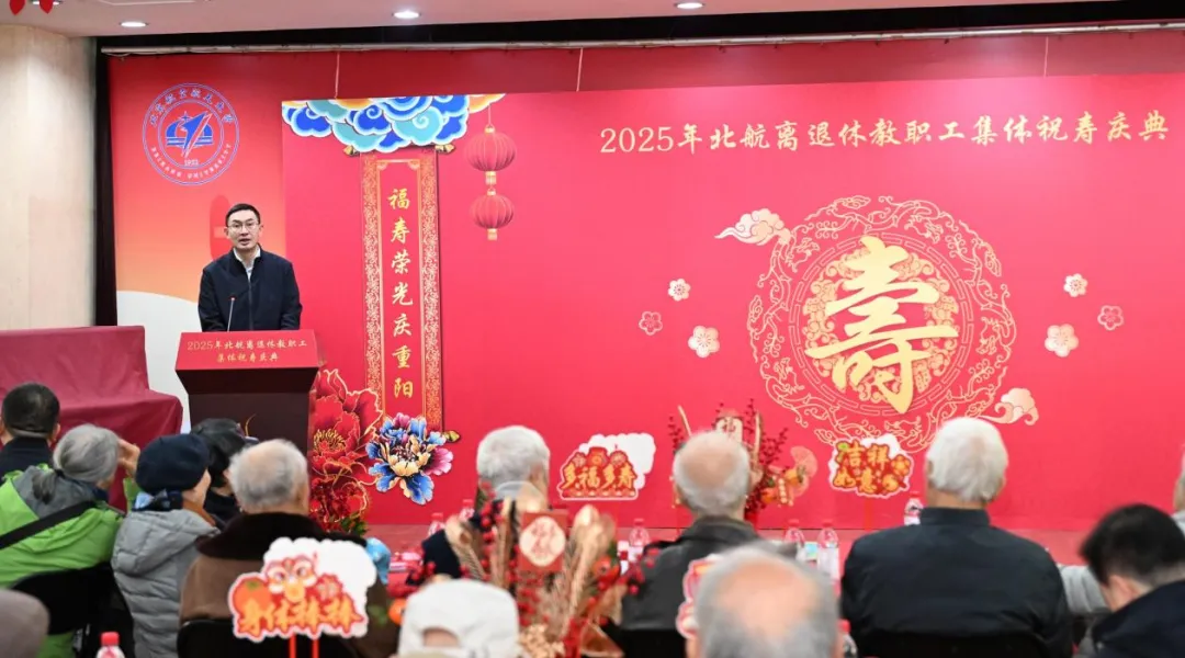 他表示,学校一直以来,始终高度重视和关心老同志。在重阳佳节来临之际,举办集体祝寿活动,既是对老同志的祝福和关爱,更是弘扬传承北航精神,表达对老同志的感谢和敬意。当年前辈们挥洒青春热血,以深厚的家国情怀践行报国之志,为北航打下了坚实的基础,各位老师贡献的智慧和积累的经验,成为激励北航人不断前行的力量源泉。希望寿星们继续保持乐观向上的心态,享受健康、快乐的晚年生活;也希望老同志们关注学校发展,讲好北航故事,在薪火相传中激励广大青年师生踔厉奋发、勇毅前行。