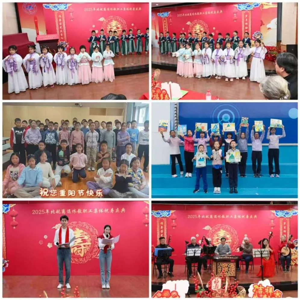 庆典现场,邀请北航大学生主持团同学主持本次活动;北航幼儿园小朋友们表演的手势舞《中华孝道》,以灵动的手势和纯真的笑脸,传递着中华民族尊老爱老的传统美德;北航附小的同学为寿星们创作了重阳节和祝寿主题绘画,还特意提前录制了合唱《小美满》,用歌声传递温暖与祝福;老年社团民乐队演奏的江南丝竹《行街》,旋律行云流水,展现了老教师们多姿多彩的晚年生活。精心制作的寿星视频,记录了老同志们的幸福生活和对祖国、对学校的深切祝福。在场寿星们脸上都洋溢着幸福的笑容。