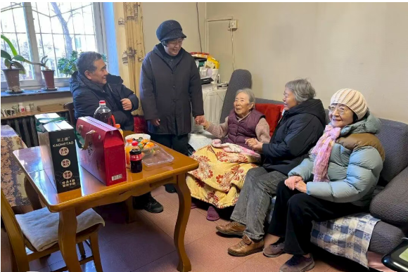 北航实验学校中学部退休党支部管理小组结合老同志居住实际,采取“思源楼集中领取+上门走访送达”双轨模式,支委们与退休老教师促膝长谈,一同回忆往昔执教岁月,感谢他们为北航教育事业发展奠定的坚实基础,更送上新春的诚挚问候与美好祝福。机关退休第三党支部管理小组、第五党支部管理小组对部分老同志进行走访慰问,支委们与老同志倾心交流,反复叮嘱老同志们保重身体、安心过节,并郑重承诺“支部永远是你们的坚强后盾,急难愁盼随时找我们”。后勤退休职工第六党支部管理小组的几位负责人奔赴多位老同志家中,面对年事已高、受病痛困扰,甚至行动不便卧床休养的老同事,他们轻声询问身体状况、细致了解生活需求,暖意透过紧握的双手静静传递;幼儿园退休党支部管理小组的几位负责人也带着满满心意走访了4位退休老同志,95岁高龄的张淑兰老师虽坐着轮椅,却精神矍铄,激动得热泪盈眶;86岁的刘春梅老师接过慰问品时,眼角眉梢都漾着欣慰的笑意,将满心的感动全然流露。一趟趟温暖的走访,不仅传递了学校的深切关怀,更收获了老同志们的深情反馈。