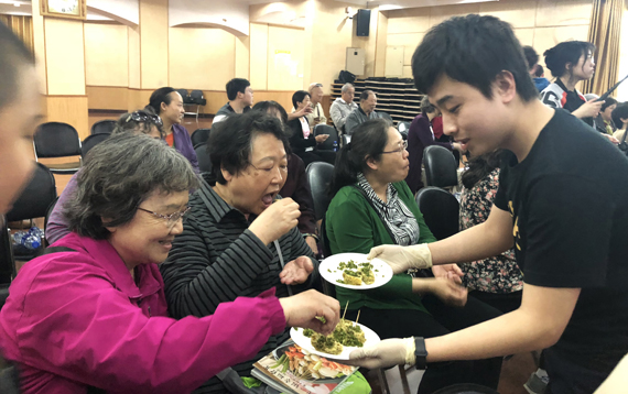 能源与动力学院大三学生王文静同学说,“退休的老师们很热情,感到他们的生活状态很积极很健康,一起参加活动开心。老师们比我们还时尚,做食物推陈出新,很羡慕。”