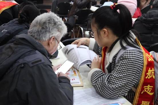 两个多小时的时间,大学生志愿者与老同志零距离的接触,一对一、手把手现场帮助指导、互问互答,在老少互相关爱的欢乐氛围中,顺利完成了“学习强国”学习平台的注册登录与使用。