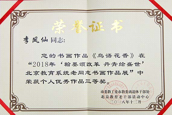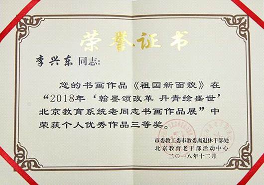李兴东老师的书画作品《祖国新面貌》和李凤仙老师的书画作品《鸟语花香》荣获个人优秀作品三等奖。