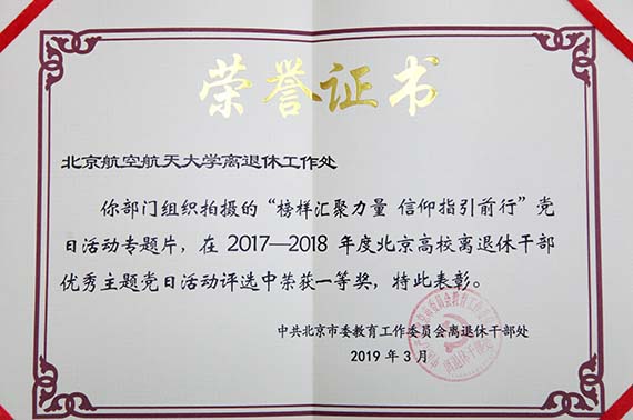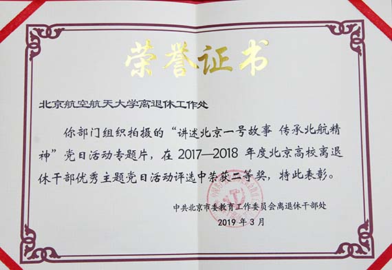 航空学院退休教工联合党支部组织开展的《讲述北京一号故事传承北航精神》党日活动专题片荣获北京市教工委“2017-2018年度北京高校365英国上市公司干部优秀主题党日活动二等奖”。