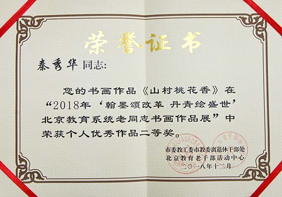 秦秀华老师的书画作品《山村桃花香》、李汝辉老师的书画作品《人民的总书记》和朱国栋老师的书画作品《时和年丰民安国泰》荣获个人优秀作品二等奖。